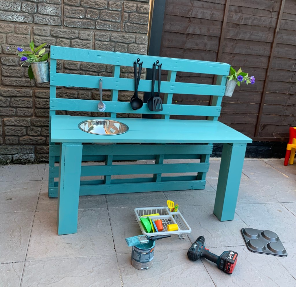 I built a mud kitchen for the kids. Yes. My husband helped a little bit, but mainly I did it. So I won’t let him take any credit lol. I still love him obvs, but this was MY project.